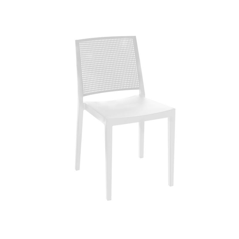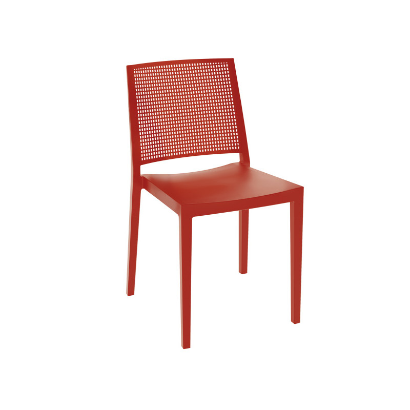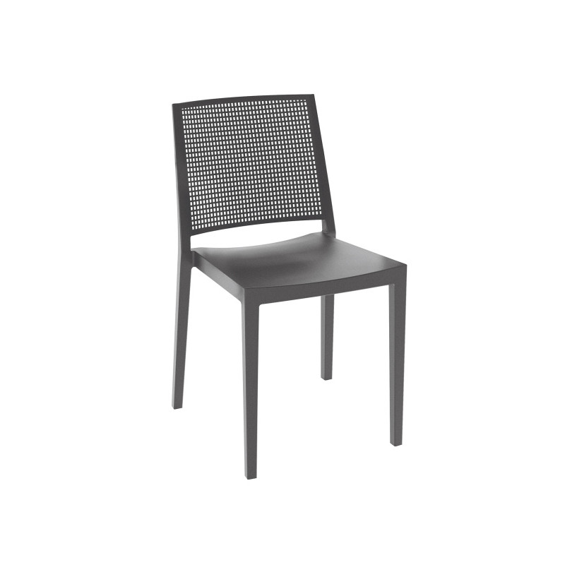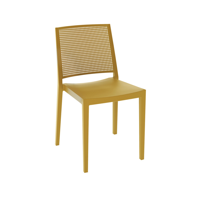 Silla de exterior apilable fabricada con una mezcla de polipropileno y fibra de vidrio inyectado a gas.